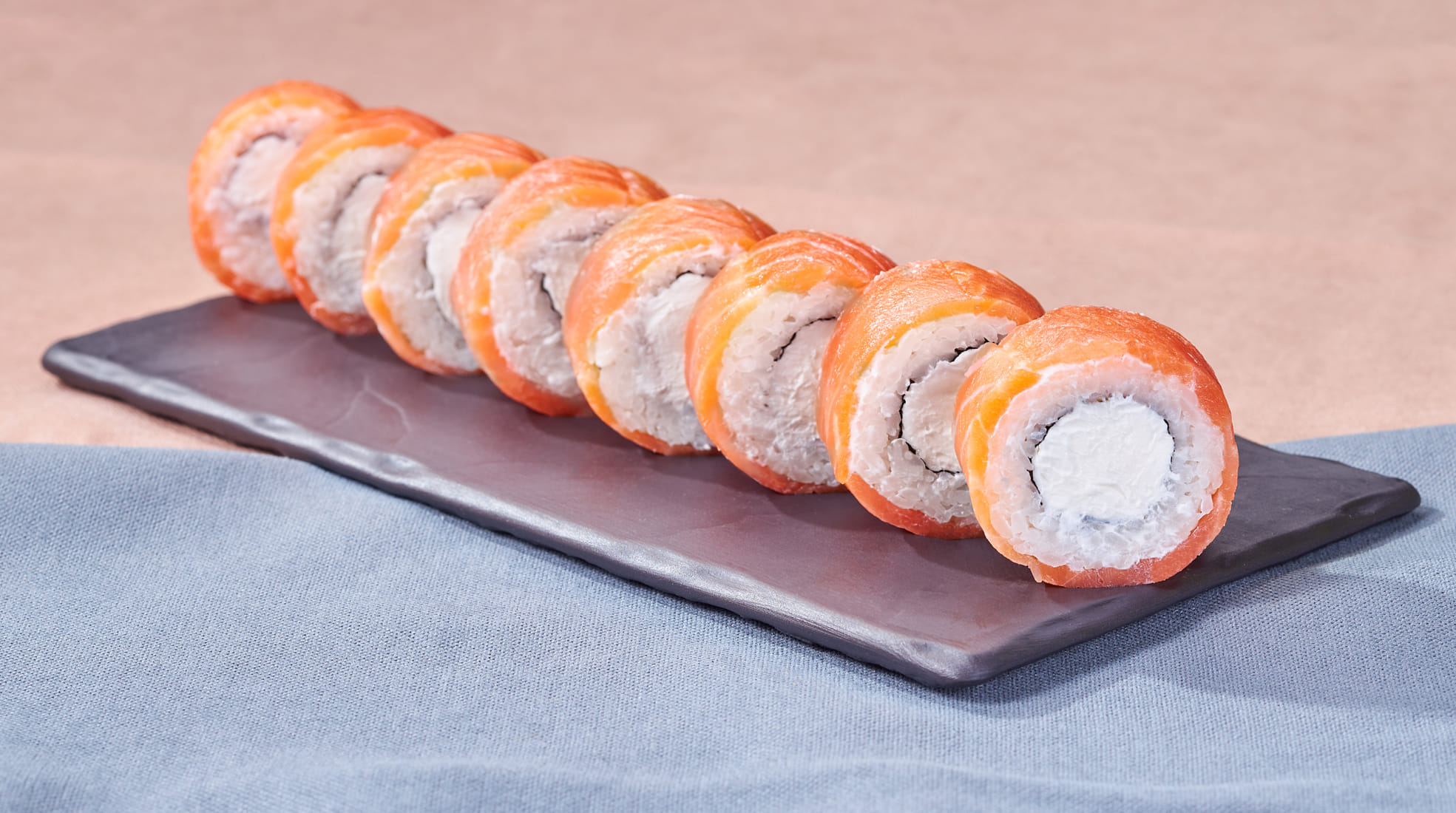 Лосось, крем чиз, рис, нори. Не забудьте заказать имбирь, васаби и соевый соус. Они не входят в стоимость заказа.