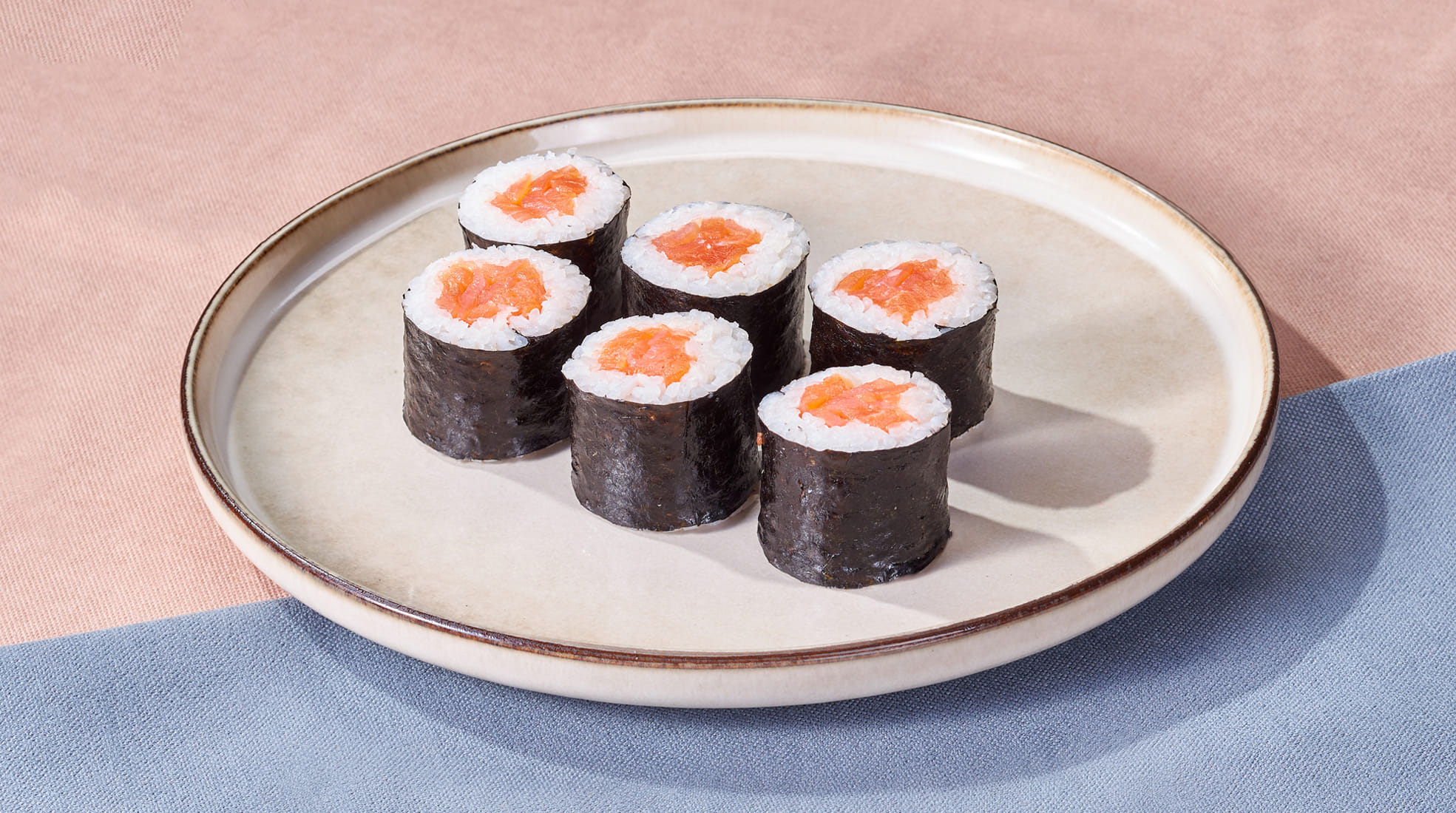 Лосось, рис, нори. Не забудьте заказать имбирь, васаби и соевый соус. Они не входят в стоимость заказа.